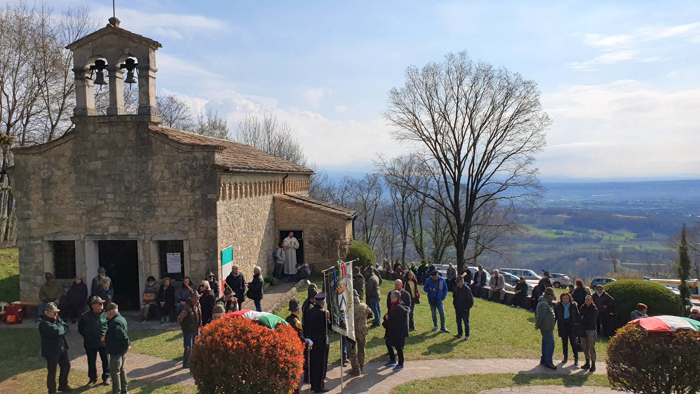 La cerimonia ha un sapore intimo: il numero dei partecipanti, anche se per lo più raccolti nel naturale anfiteatro con sullo sfondo l’altare e il monumento con i nomi dei caduti, non si quantifica, dispersi come sono anche negli spazi di un bosco cresciuto negli anni e ancora in riposo, mentre la vista della pianura e dell’ampio corso del Tagliamento apre a pensieri di ricordi, terre lontane e memorie.